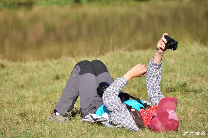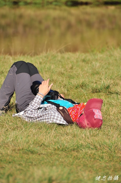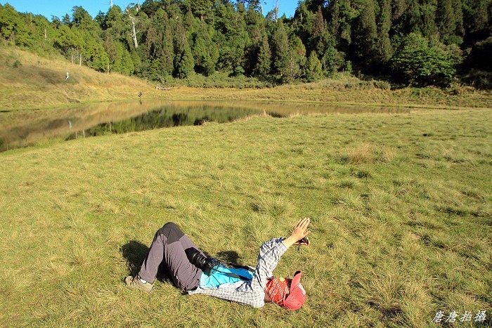 當您躺在草地時,我有氣無力的走到偉蛋池草原~好像這是老天爺的安排。我只好卸下背包,因為斜射陽光下偉蛋池與白木林融成另一種的水漾森林視界。真是感激啊!老天爺不斷地賜予美景…