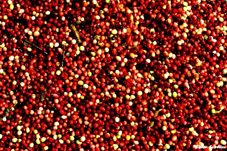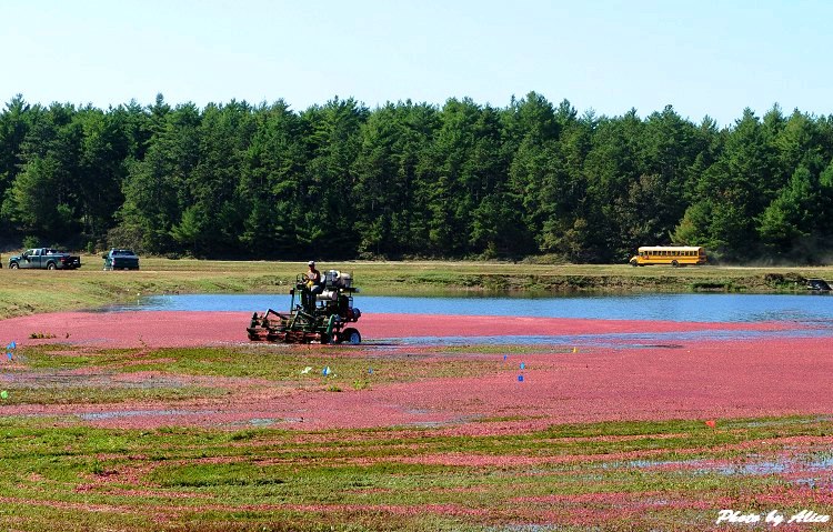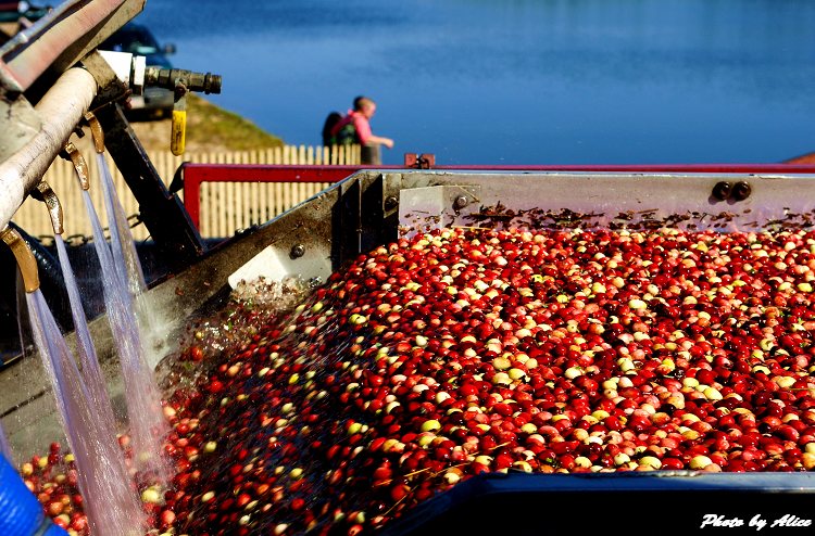 原來,蔓越莓是生長在矮藤上,整片未採收的蔓越莓田,看起來很像一堆亂草,實在不怎麼吸引人,採收方式有兩種,一種是乾收,另一種是水收。這裡的蔓越莓幾乎都是採用水收的方式,因為蔓越莓內具有氣囊,具有極佳的浮力,水收就是利用這個特性而生的採收方式,採用水收的蔓越莓田四周都有引水溝,在採收時引水進田,當水淹沒蔓越莓藤蔓時,好的蔓越莓就已具有浮出水面的力量,再利用具渦輪般車輪的採收車打擊水面,使蔓越莓可以脫離藤蔓完整浮出水面,因此,在採收時,一整片的蔓越莓浮在水面上,也就形成了非常特殊的畫面。