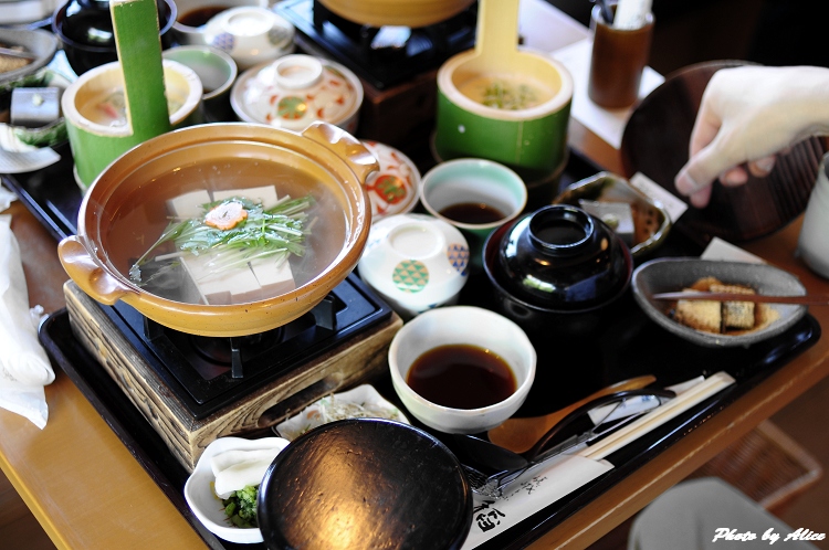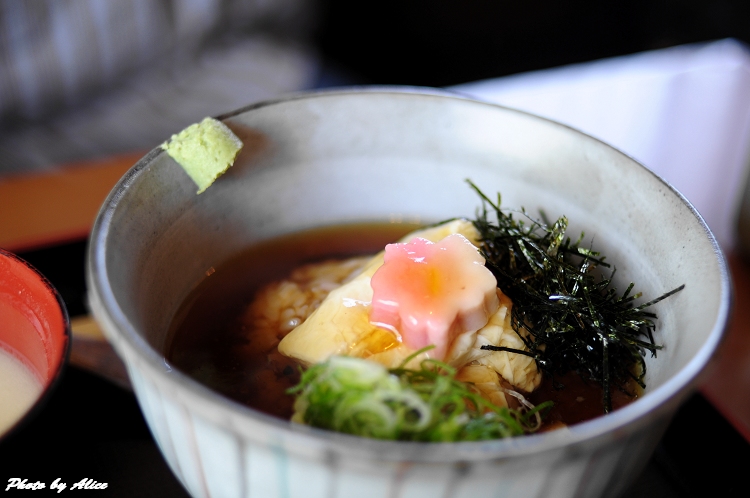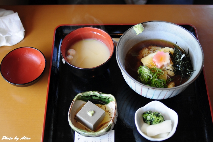 平常就很喜歡吃豆腐的我,來到這赫赫有名的豆腐之鄉,當然要嚐鮮一下,沒有一定要吃名店的迷思,找了一家在天龍寺附近看起來還算順眼的店,試吃了擺在一樓的兩種不同豆腐,覺得口味不錯,就走進位於二樓的用餐區,躲躲正中午毒辣的太陽兼享受豆腐料理。