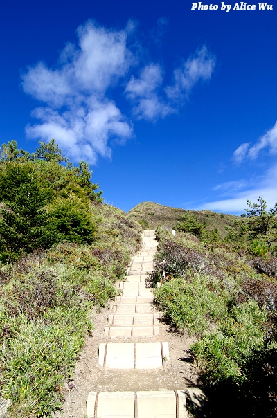 老天爺很幫忙,一大早給了很美麗的天氣,藍天白雲的,讓我將所有的煩惱和擔憂拋諸腦後,這麼好的天氣,這麼美麗的山景,不爬山真的太可惜,有了美麗的心情,這一次,我用自己的步調和呼吸,一步一步的前行,走到當時發生狀況的0.4K時,有一種像是征服了什麼似的心情,過了這一關,心情莫名的放鬆了,步伐也變得輕盈了起來!