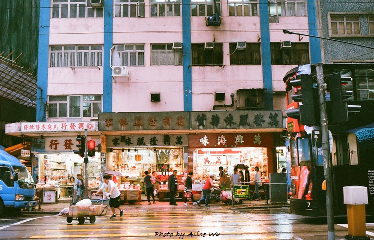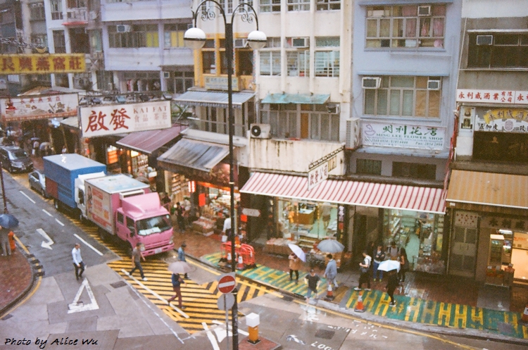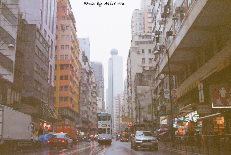 不幸的,走著走著,雨勢漸大,我們躲在一個街角屋簷下躲雨,他手上握著的是一台已經有七年歷史的Kodak傻瓜數位相機和風一吹就會倒的小腳架,雖然,他不像我周圍的攝影朋友們有著各自喜愛的專業相機,但他渴望認識這個城市的熱情,讓他拍攝照片的角度有異於我們這些喜愛攝影的人們,就這樣,他用他的傻瓜數位相機,我用我的底片相機,我們無視於來來往往的人們對我們投以異樣的眼光,在那個下著雨的午後,在那街角的屋簷下,我們用各自的角度拍下雨中的香港印象!