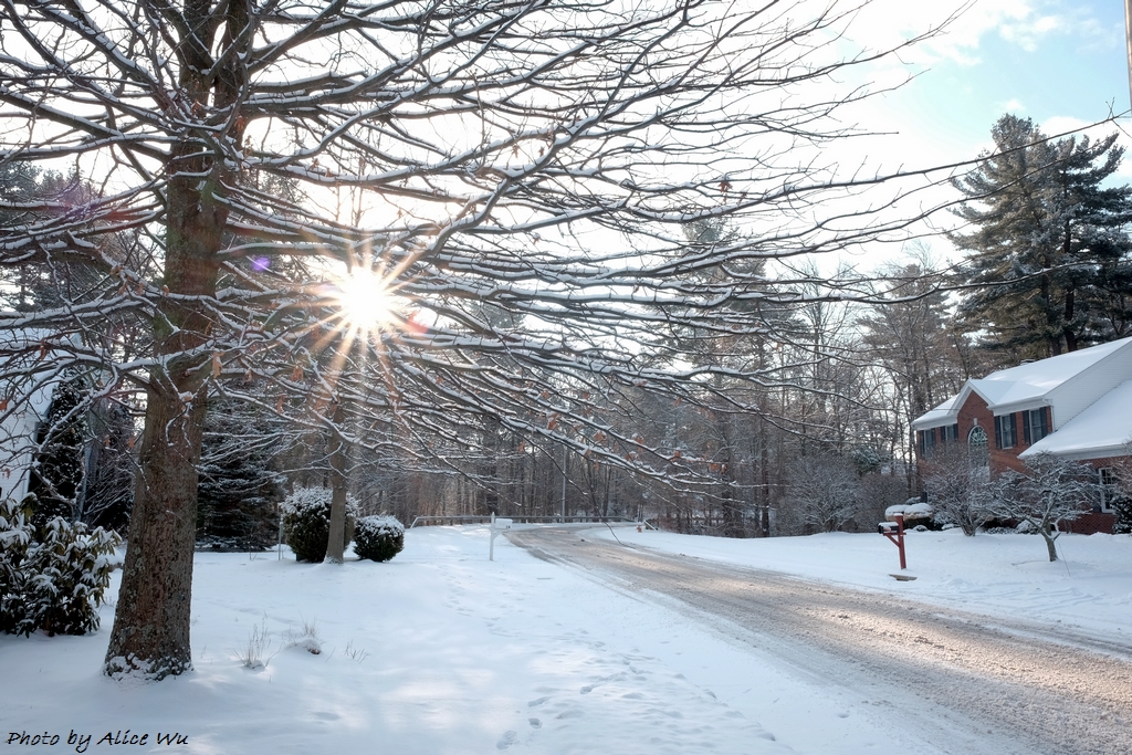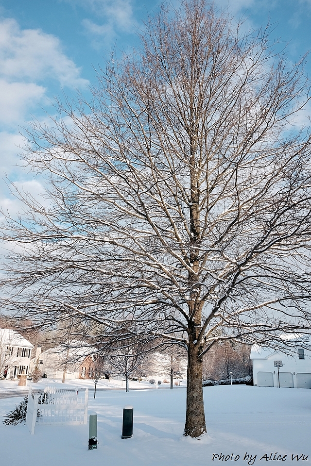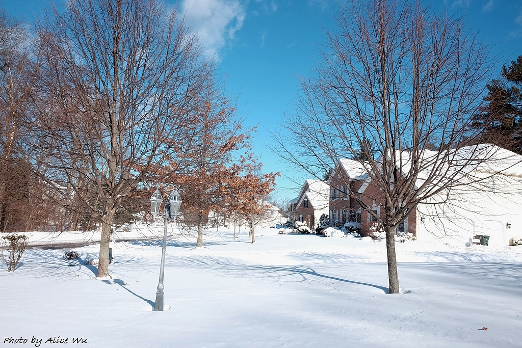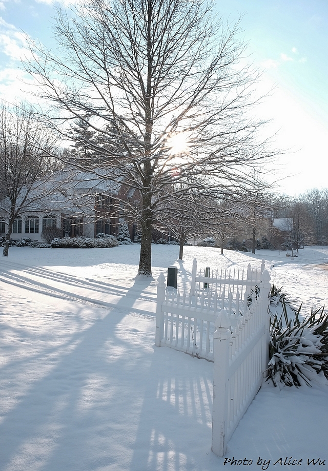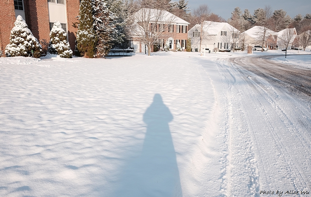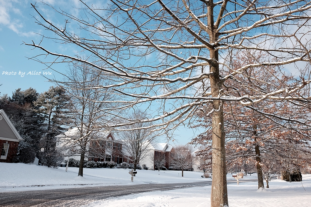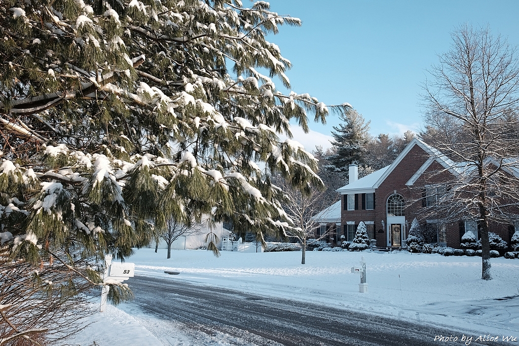 那是我在美國第一場雪的隔天早晨,起床後從窗外看到那片銀白色的世界,陽光灑落在潔白的雪上,美麗耀眼的叫我睜不開眼,快速的解決了我的早餐後,立刻著裝背起相機投入那一片雪白的世界。