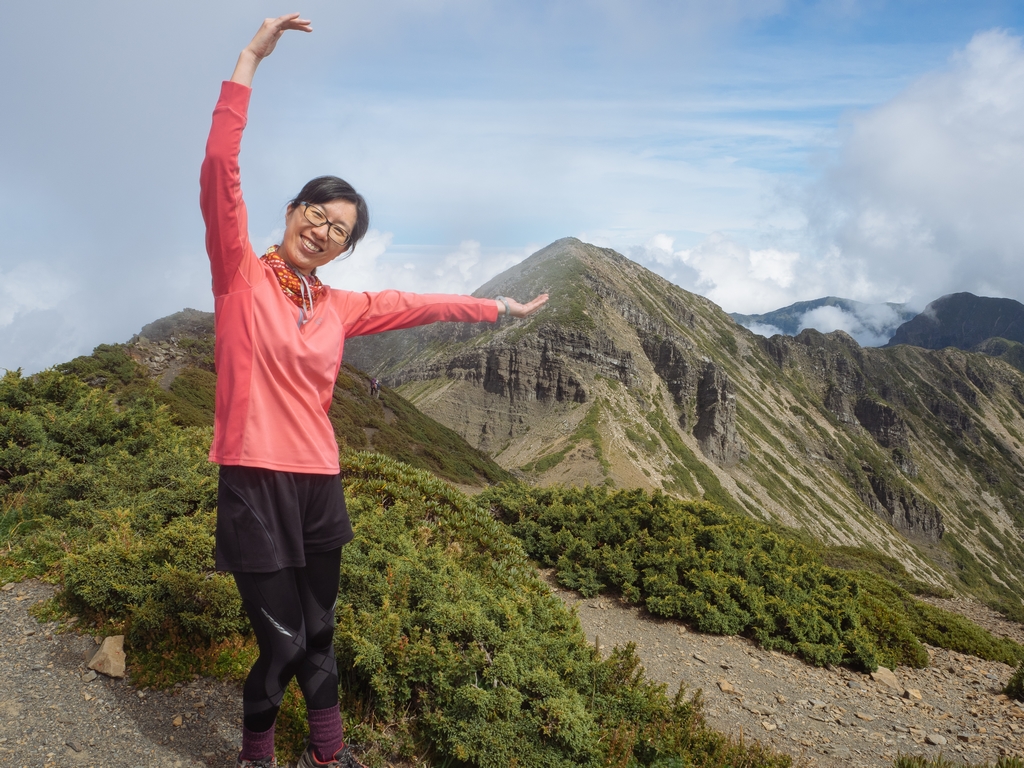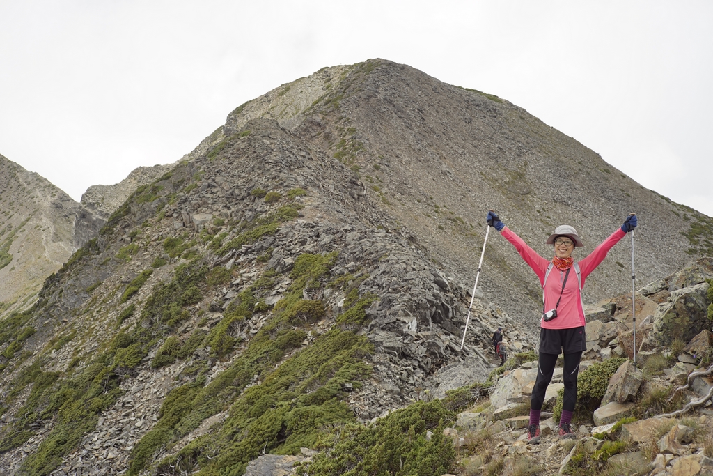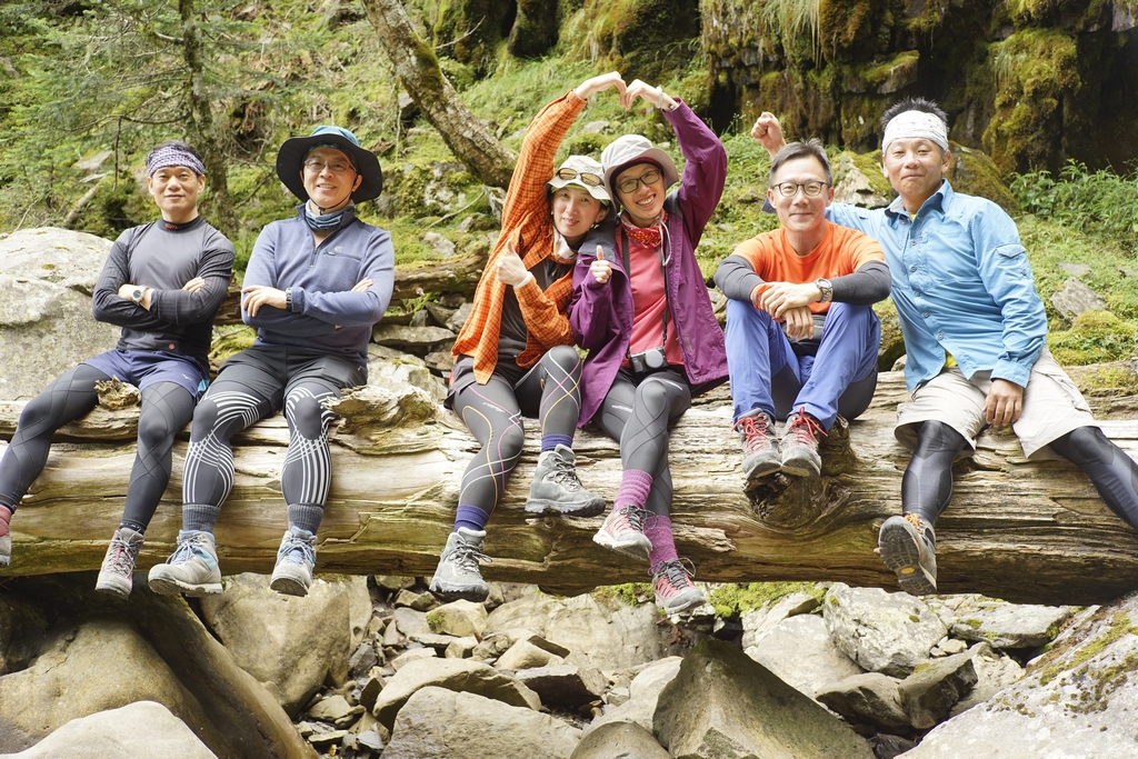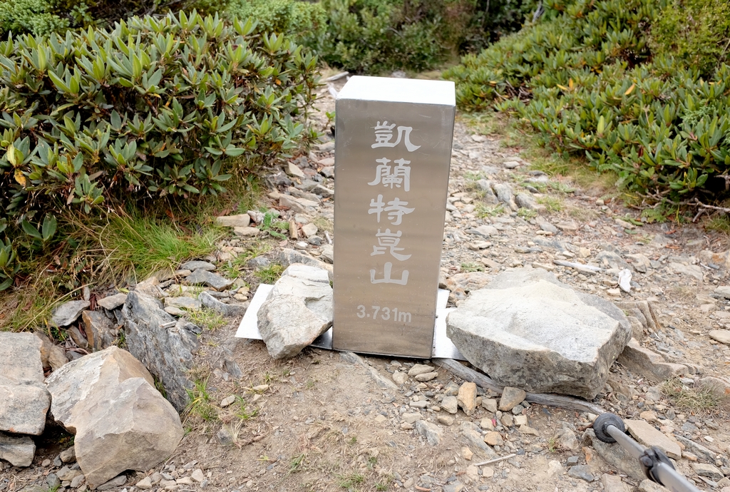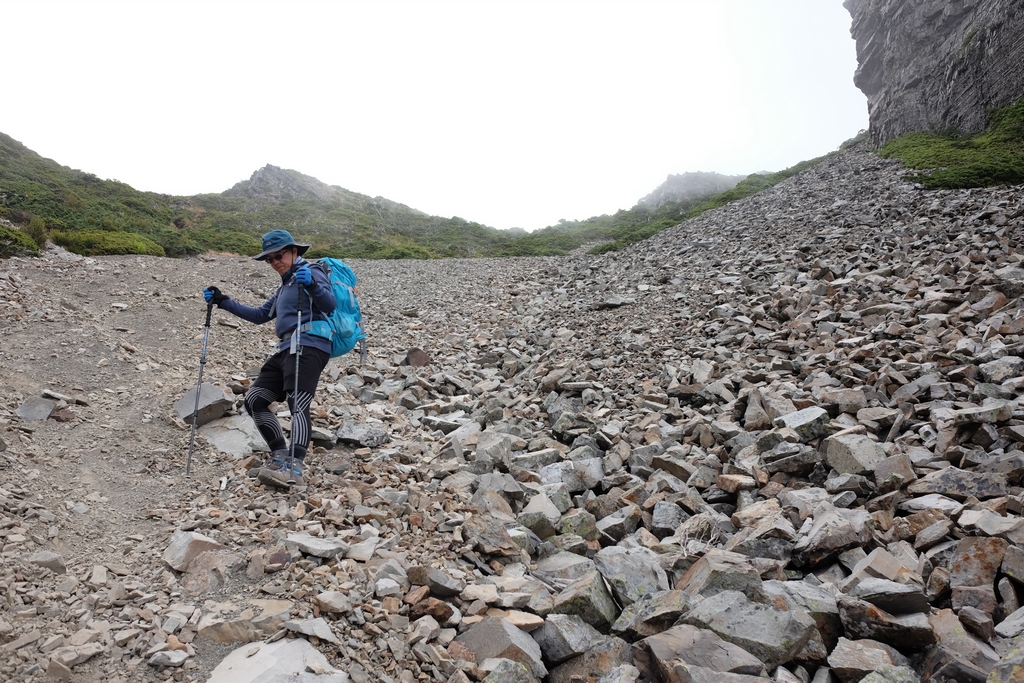 最難忘的應該是走過凱蘭特崑山後要下切的時候,我站在叉路口的指示牌望著眼前的山谷問說,路在哪?歐陽和健忠說,就那條啊!哪條啊?我根本沒有看到路,只看到一個大約45度又滿是小碎石或泥沙的斜坡,什麼?要從這裡下切?那跟站著溜滑梯有什麼不一樣?這不就是一個想剎車也剎不住的概念,一路滑下去就對了?這時候,只會看到身旁有經驗的前輩們笑著告訴你,對啊,就是這條,登山杖拄著撐著,很容易的,別怕。(心裡的OS:真的,最好是這麼的容易啦,是沒看到我都笑不出來了嗎?)