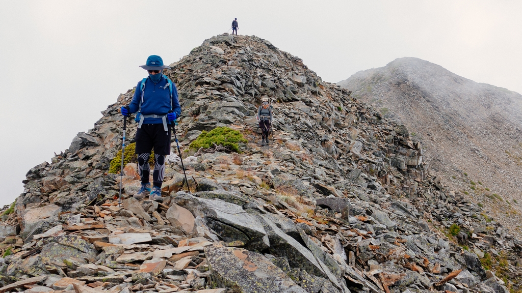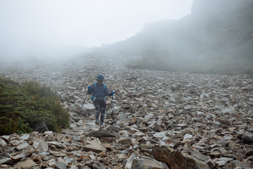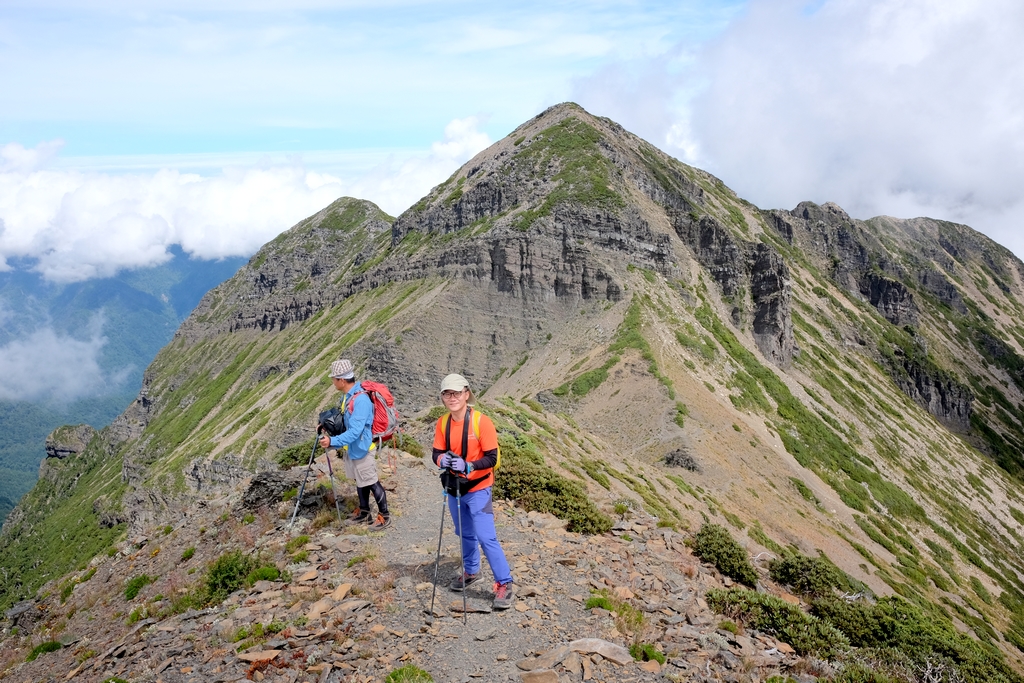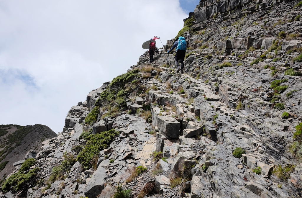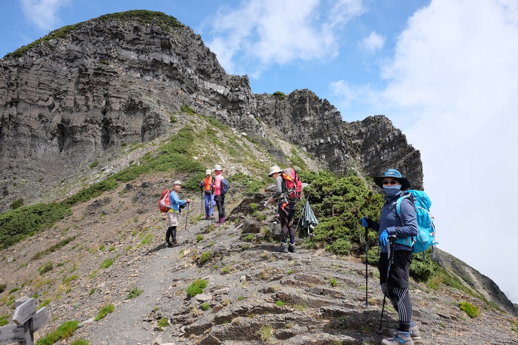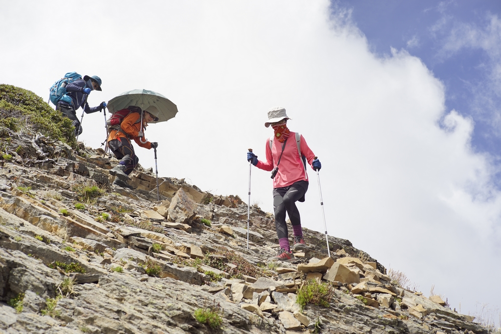 最難忘的應該是走過凱蘭特崑山後要下切的時候,我站在叉路口的指示牌望著眼前的山谷問說,路在哪?歐陽和健忠說,就那條啊!哪條啊?我根本沒有看到路,只看到一個大約45度又滿是小碎石或泥沙的斜坡,什麼?要從這裡下切?那跟站著溜滑梯有什麼不一樣?這不就是一個想剎車也剎不住的概念,一路滑下去就對了?這時候,只會看到身旁有經驗的前輩們笑著告訴你,對啊,就是這條,登山杖拄著撐著,很容易的,別怕。(心裡的OS:真的,最好是這麼的容易啦,是沒看到我都笑不出來了嗎?)