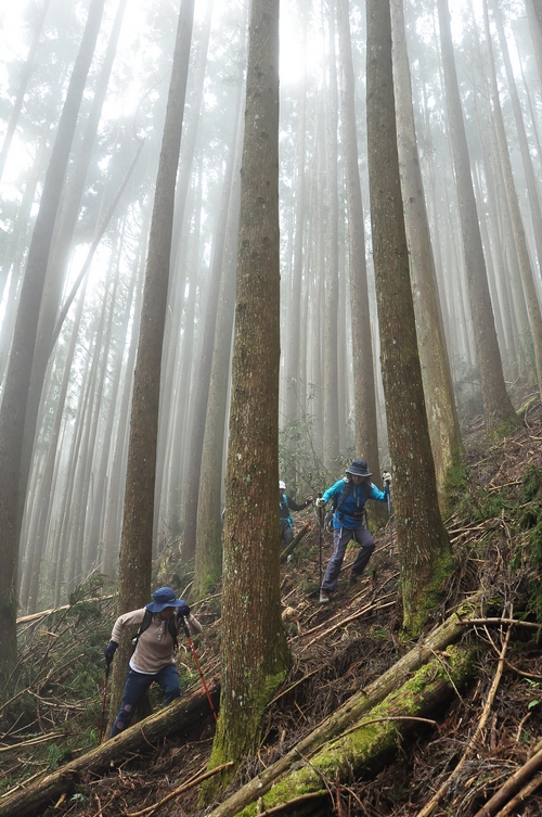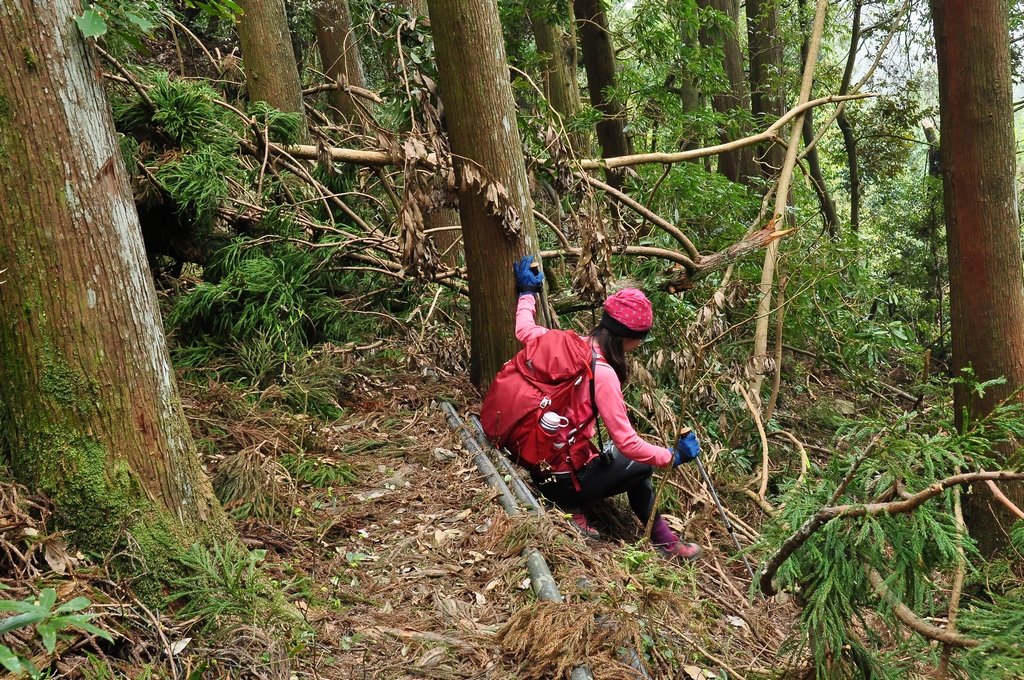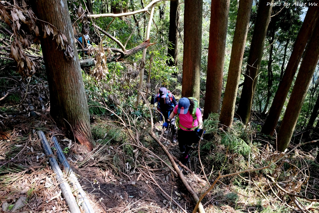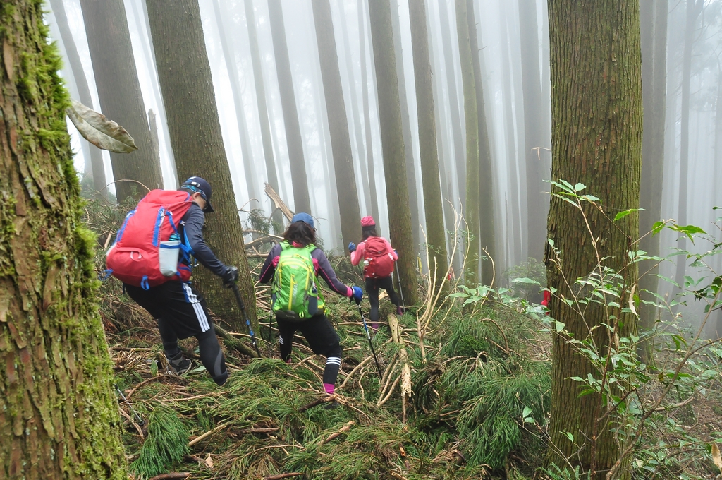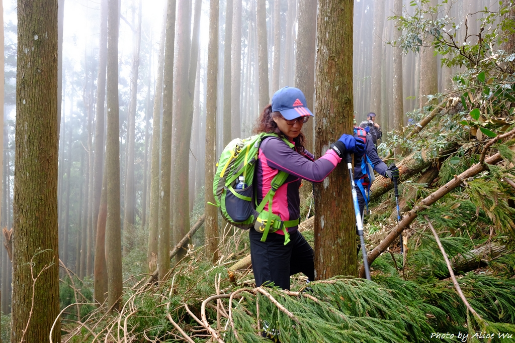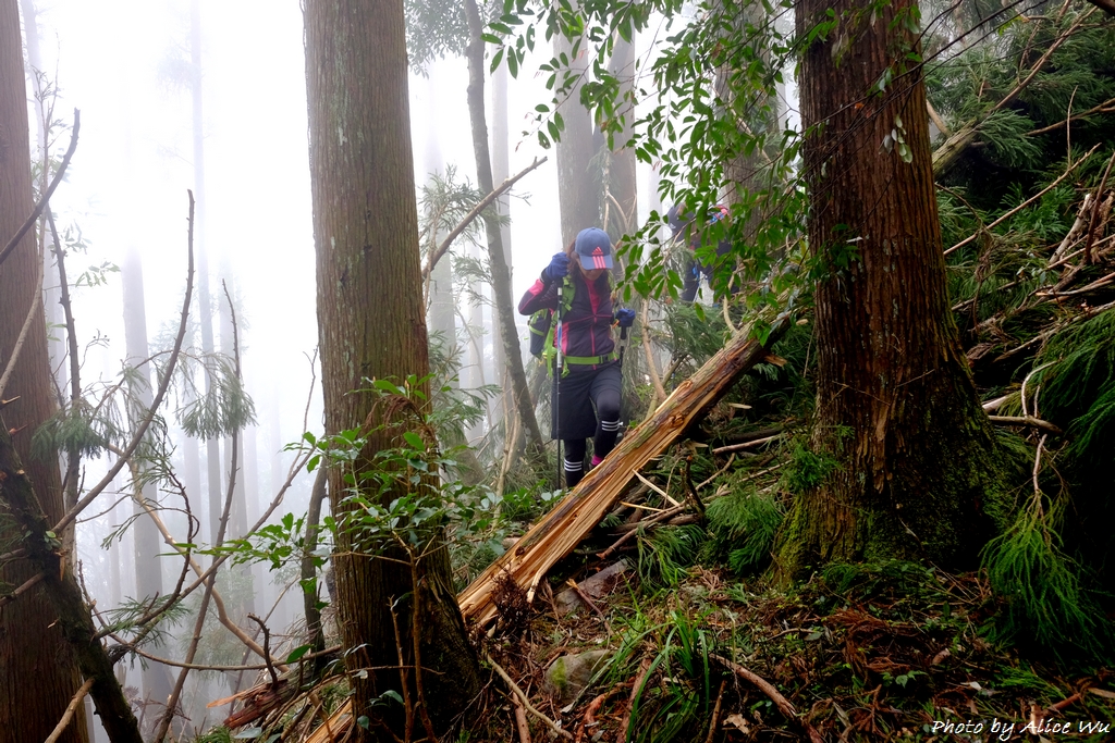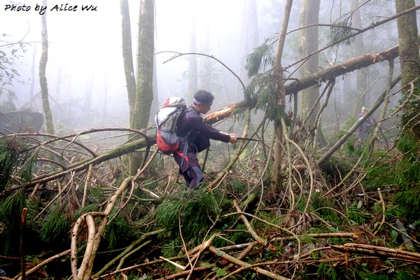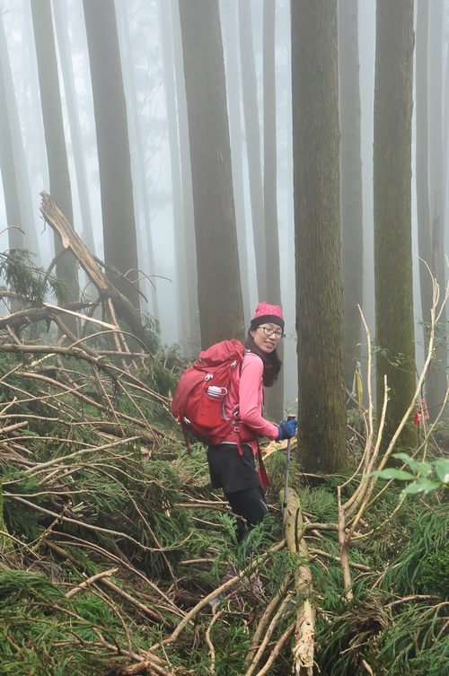 沿途,心裡和嘴上最常想、最常問的就是【路呢?怎麼變成這樣?】說這趟山行是趟披荊斬棘的行程,一點都不誇張,好幾處不只手腳並用,路徑都被倒木給覆蓋住了,爬過去也不是,下切也不是,還好我們的嚮導專業的很,身上帶有工具,我們沿途還順手整理了一些路段,讓後面的人可以好走一點避免迷路,不過讓人很不解的是,去年八月到現在,印象中沒有這麼嚴重的颱風可以讓森林中的樹木倒成這樣的,難不成是年初的寒流大雪也波及到了中海拔的森林?這裡,海拔還不到2000公尺,只能說,不管是什麼原因造成的,大自然的影響力真的不容小覷啊!