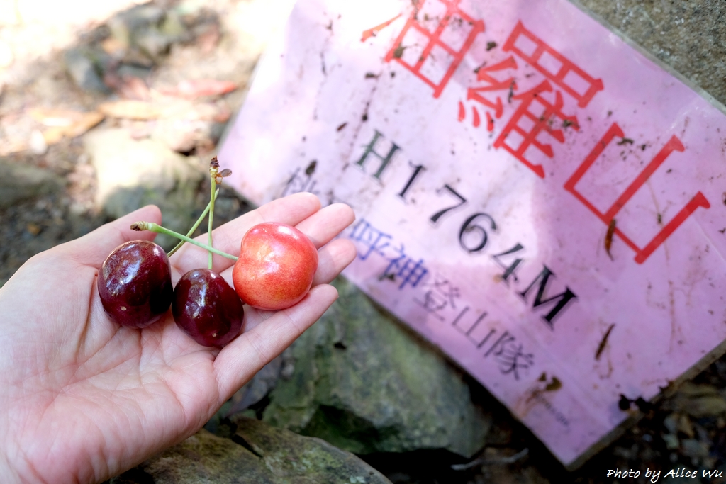 到了三角點,我問健忠,我的集點卡呢?健忠說,等來了10次再發,哇!最好是啦!好吧!那只好拿三顆櫻桃來充數,我問,來第三次吃三顆,那完百的時候呢?健忠說那他就扛一箱上來,哈哈哈!到底要不要為了那一箱櫻桃,來挑戰這個另類的【完百】呢?