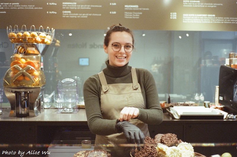 飄洋過海帶回家?實在有點麻煩,萬一壓壞了更得不償失,那不如讓我好好品嚐一下,剛好這位可愛的姑娘說了可以到裡面點杯咖啡,再來挑選想要嚐試的巧克力,正好,正想來杯咖啡呢!不知道是不是吃了太多巧克力產生了太多的腦內啡,心情好High,在走進裡面的咖啡店前我問她,可以讓我拍一張她的照片嗎?