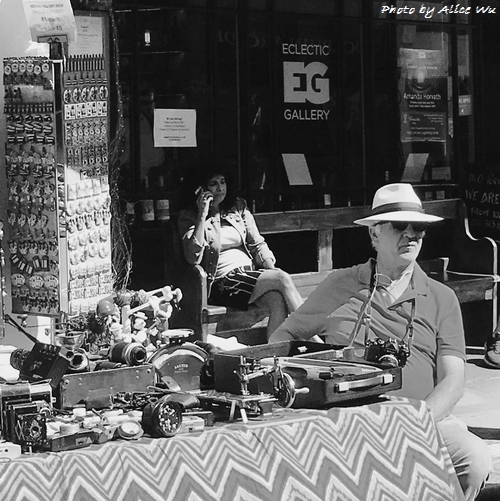 或許是喜歡攝影的關係吧,一眼就被這個在店面門口設置的臨時攤位吸引,因為上面有各式各樣的老相機。午後的瞌睡蟲頓時被這些老相機給趕跑了,我專注的看著各式各樣的二手底片相機,說不出來那是一種什麼樣的心情,我沒有追求或收集設備的習慣,對於老相機也稱不上熟悉,但,看到這麼多的底片相機,那是一種在他鄉遇到熟悉的雀躍,有一點像在國外旅行多天後吃到好吃中國菜的心情一般!