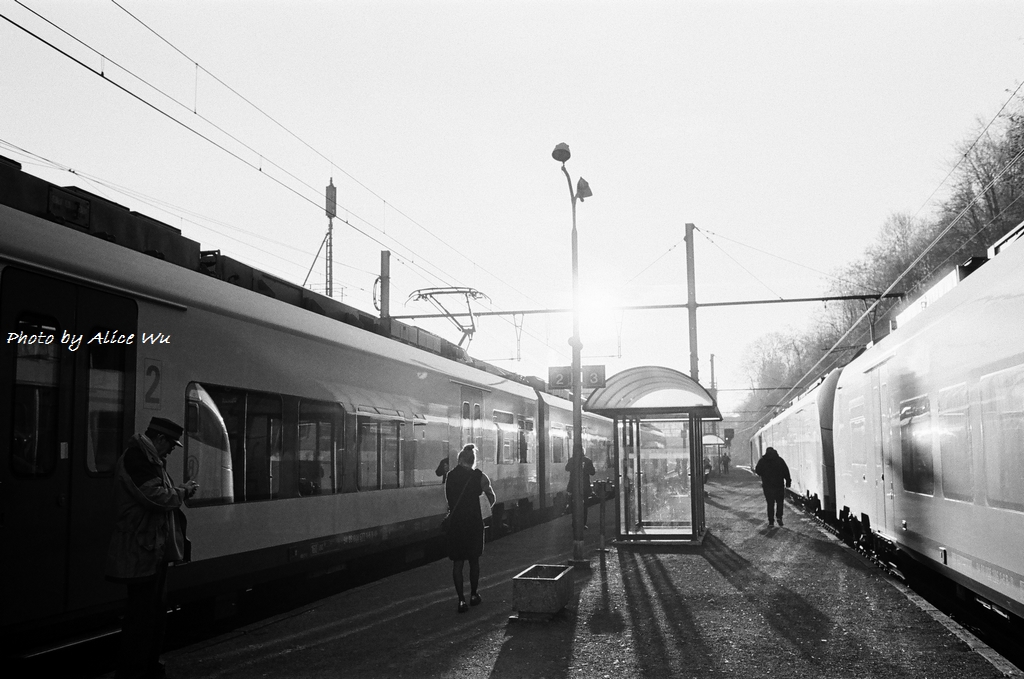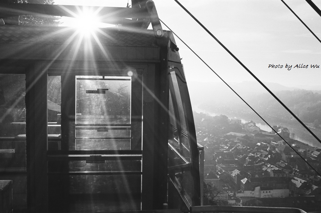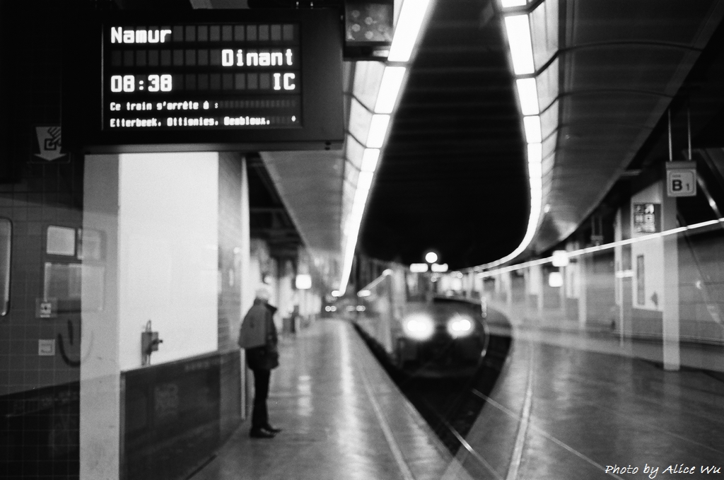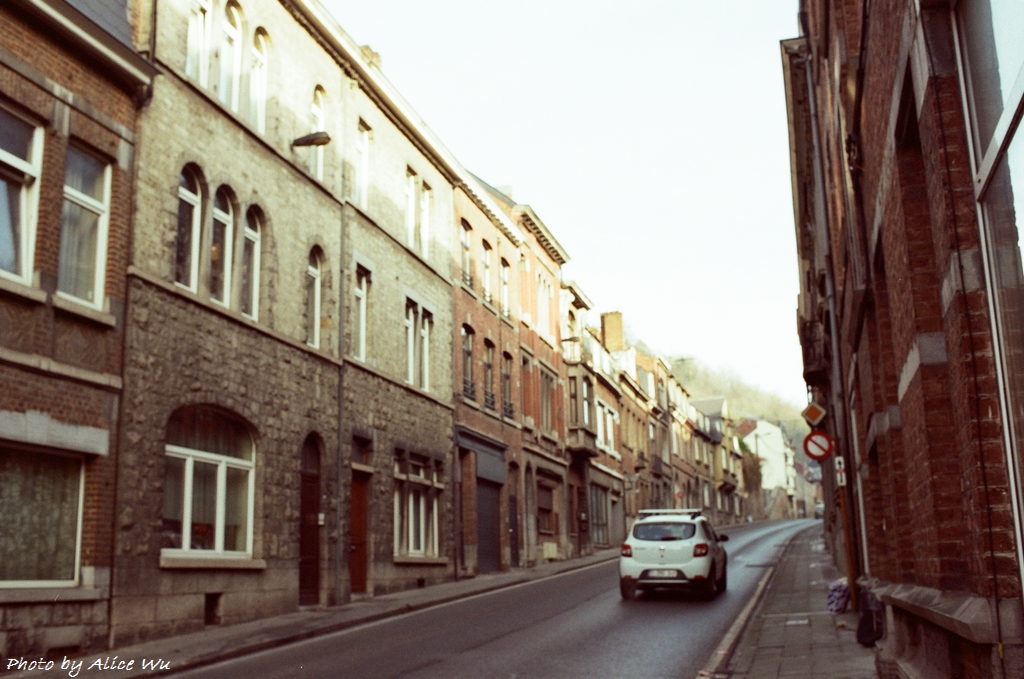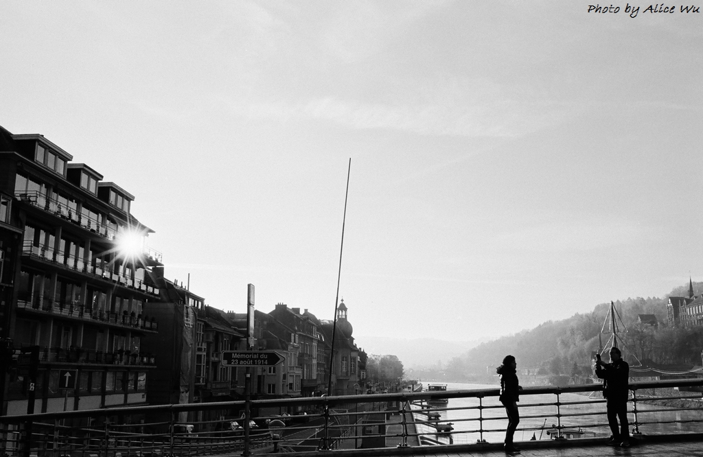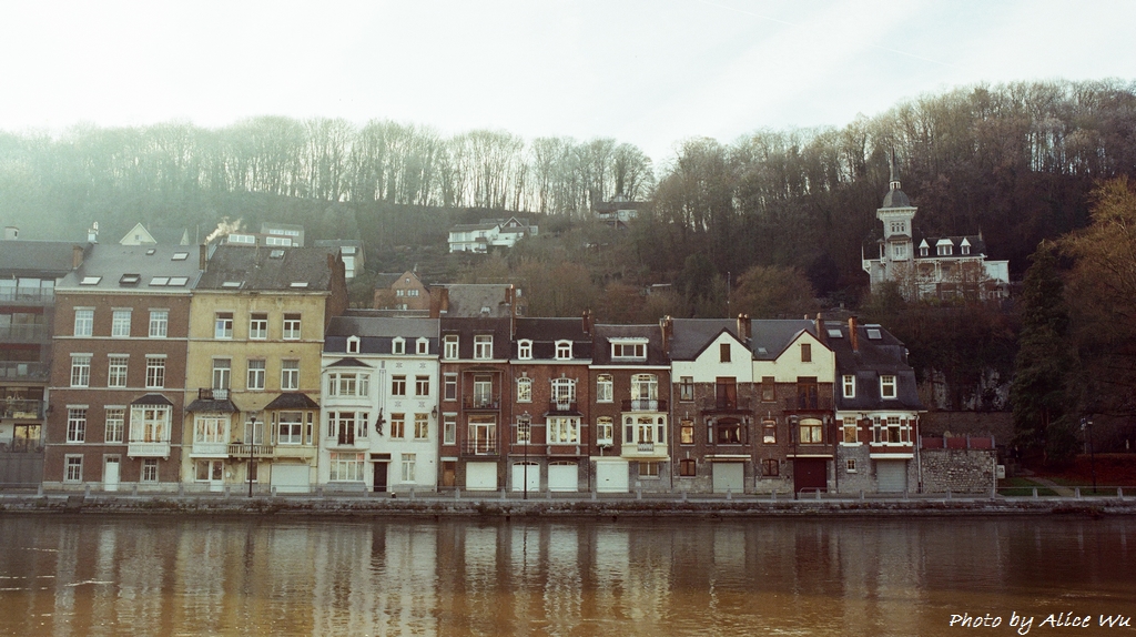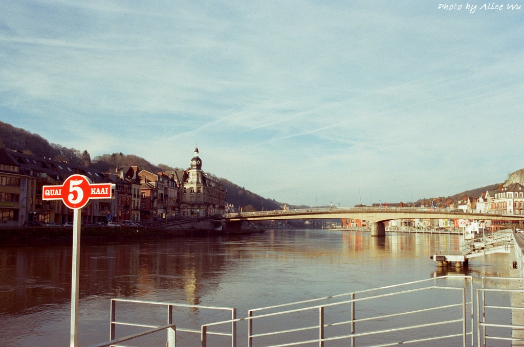 比利時是個不大的國家,搭火車三小時就可以抵達荷蘭,那麼這個搭火車往南兩個小時的小鎮,真的就是再遠一點就到法國邊界了呢!搭上早班的火車前往迪南,窗外的景致從城市漸漸轉換為山丘與森林,天色也由黑暗轉為明亮,那種在火車上、在旅行途中看著太陽升起,是一種很奇妙的快樂!天色漸亮之後,發現窗外景致多了一層白色,原以為是夜半冷冽的低溫所結出來的霜,但仔細一瞧,倒又有點像是一層薄薄的雪,直到我們步出車站之後,才確定那的確是雪,因為那迎面而來的低溫冷風,確確實實是會下雪的溫度和味道啊!