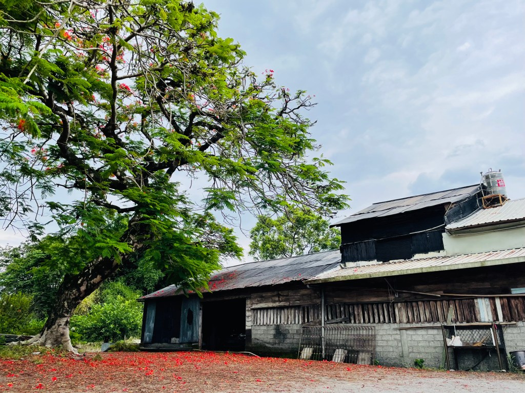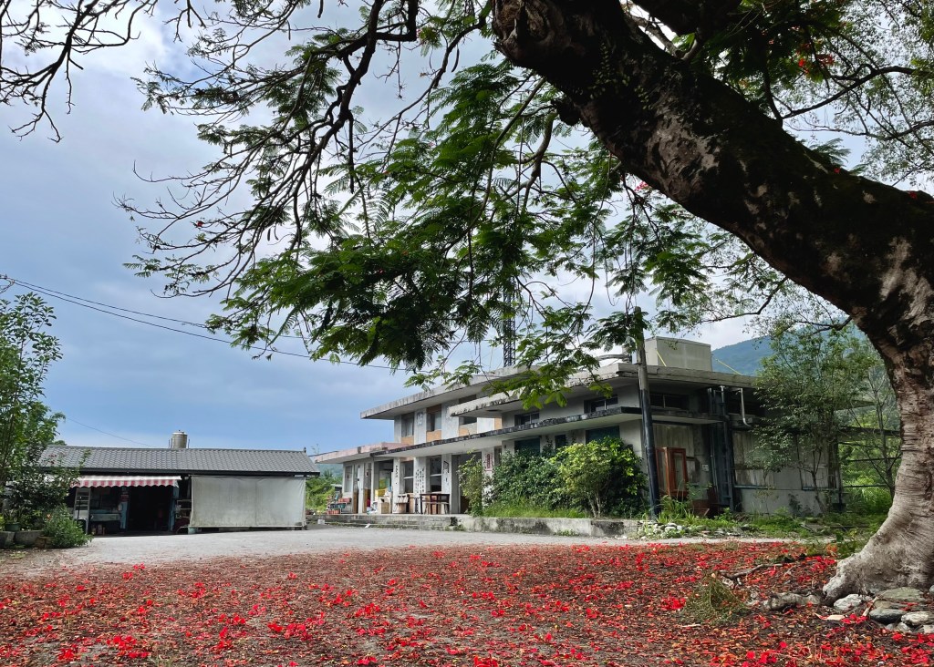 車站很小,也已雜草叢生到有點面目全非了,車站前佇立的那棵鳳凰花,灑落一地的豔紅,街道上的房舍,交錯著古早與現代的風格,但幾乎都門窗緊閉,不知道是居住於此的人不多了,又或只是沒有打開門窗。