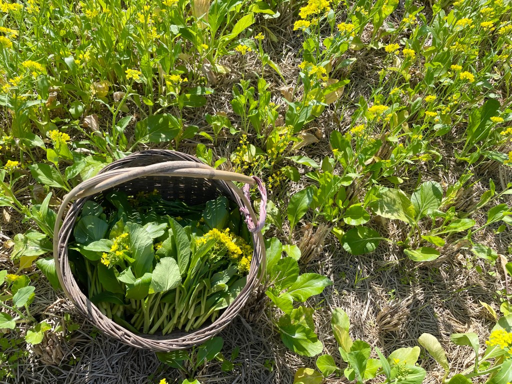 我真的是一個城市俗,不確定我有沒有吃過油菜花,但更吸引我的其實是「村姑體驗」,大哥給了我一把剪刀和竹籃,知道我沒採過,還要先教學怎麼辨別嫩葉和過老的油菜花,試著採了一些,想是我的「手腳慢頓」讓他看不下去了,覺得我這樣採到天黑應該也採不足一盤的份量吧,後來把他竹籃裡的通通裝袋讓我帶走了。